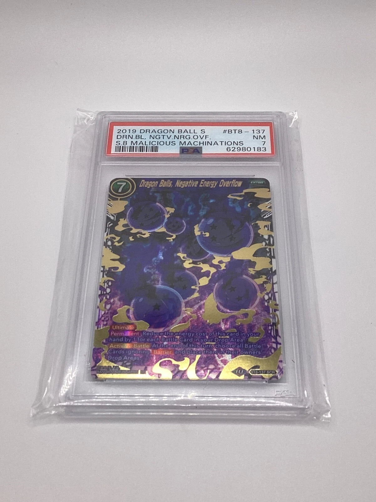 Dragon Ball Super Card Game's BT8-137 "Dragon Balls, Negative Energy Overflow" in Secret Rare (SCR) condition represents a highly sought collectible from the Burst Impact set. This PSA 7 graded specimen showcases excellent card quality with sharp corners, vibrant colors, and minimal wear. The Secret Rare designation makes this a premium pull, featuring stunning alternate artwork and premium foil treatment. Ideal for serious collectors and competitive players alike, this card combines aesthetic appeal with strategic value in constructed decks.