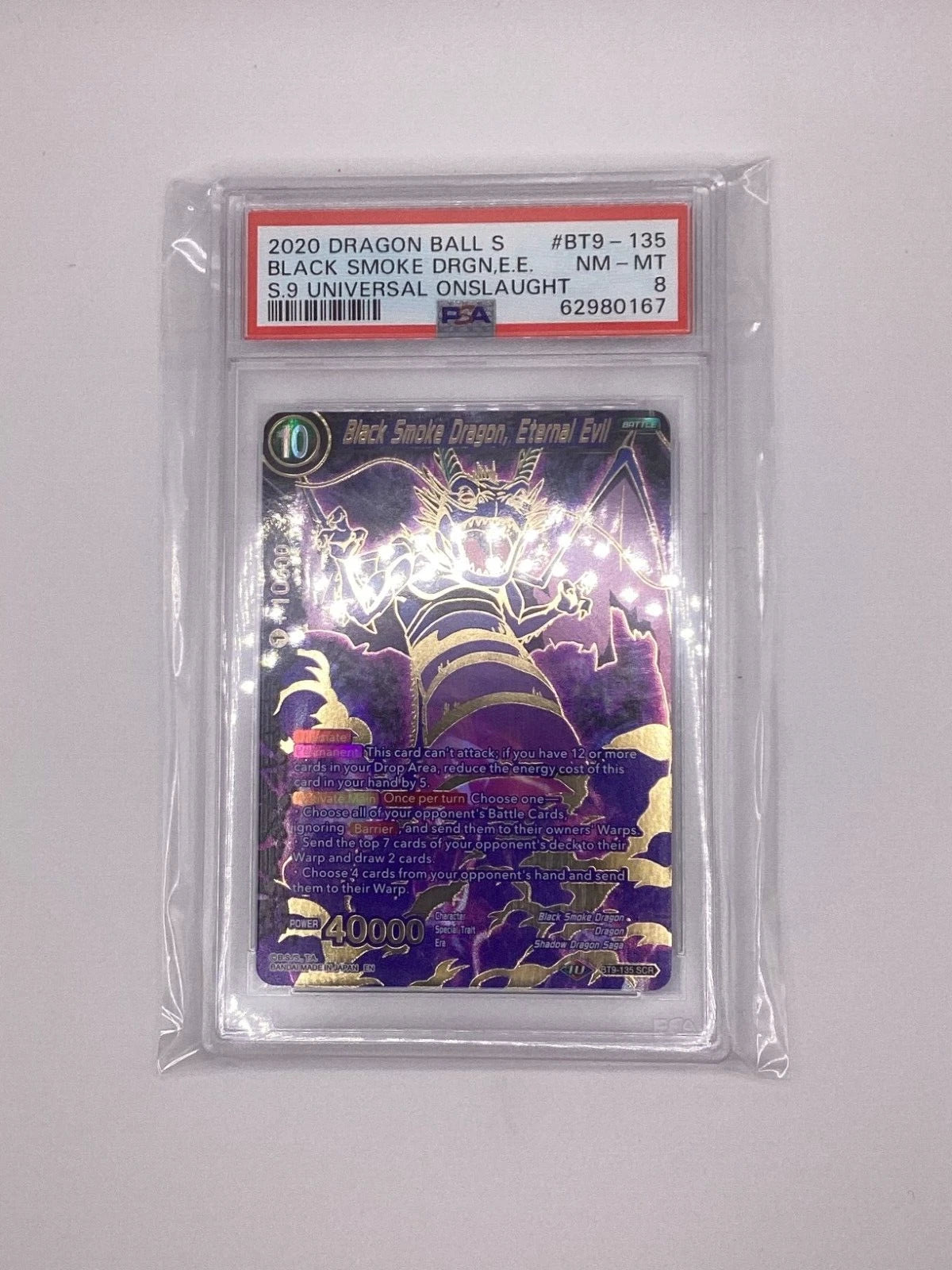 Black Smoke Dragon from the Eternal Evil set (BT9-135) represents a premium collectible for serious Dragon Ball Card Game enthusiasts. This Super Rare (SCR) version has been professionally graded PSA 8, confirming excellent condition with minimal wear. The card showcases exceptional artwork and remains a sought-after addition to competitive decks and high-end collections. Perfect for players seeking tournament-viable cards or collectors pursuing complete set acquisitions.