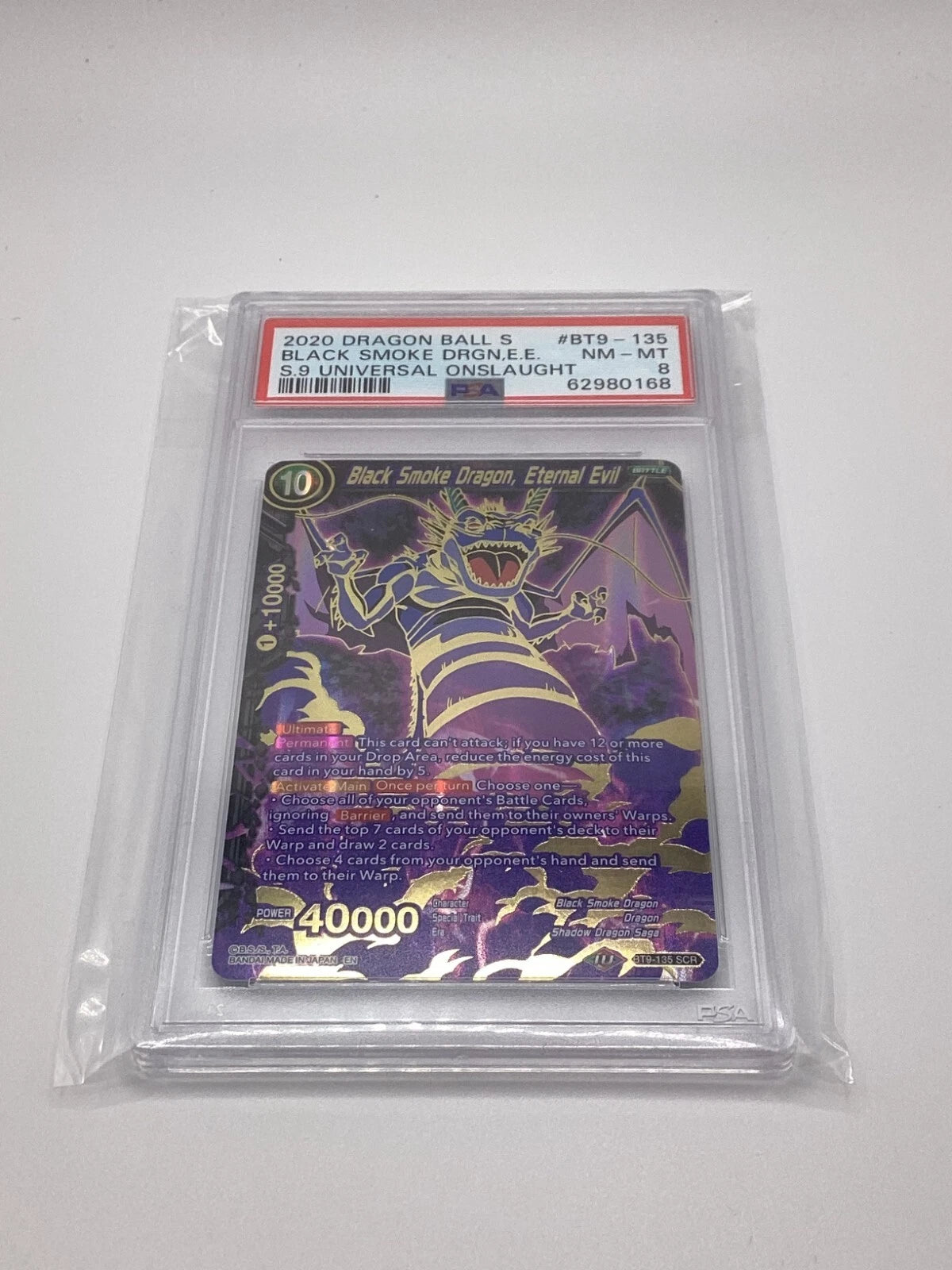 Black Smoke Dragon from the Eternal Evil set (BT9-135) represents a premium collectible for serious Dragon Ball Card Game enthusiasts. This Secret Rare variant has been professionally graded PSA 8, confirming excellent condition with minimal wear. The card showcases exceptional artwork and remains a sought-after addition to competitive decks and high-end collections. Perfect for players seeking powerful gameplay mechanics or collectors pursuing complete set acquisitions. Authentic grading provides confidence in both playability and investment value.