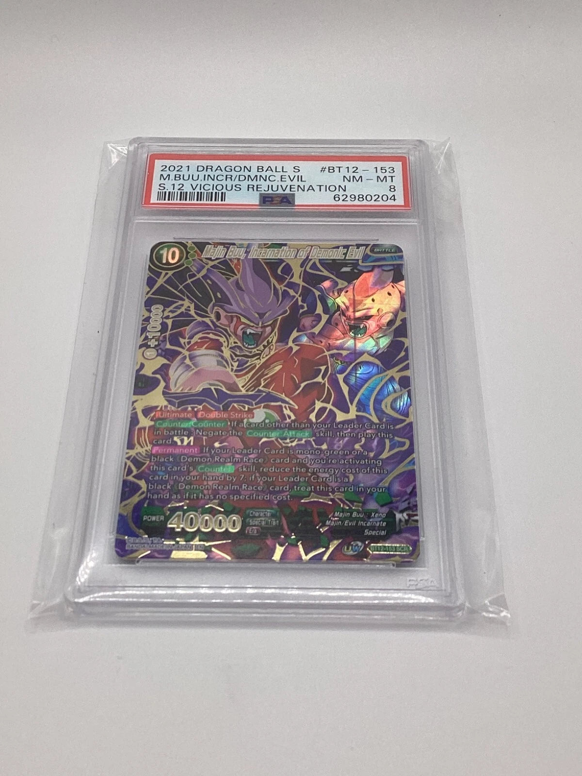 Majin Buu, Incarnation Of Demonic Evil from the Dragon Ball Super Card Game represents one of the most sought-after cards in the BT12 set. This Secret Rare (SCR) version of BT12-153 showcases stunning alternate artwork and premium card stock. Graded PSA 8, this card demonstrates excellent condition with sharp corners, vibrant colors, and minimal wear. A cornerstone piece for competitive players and collectors alike, this card combines playability with investment potential. Perfect for completing your Dragon Ball collection or building a formidable deck around one of the franchise's most iconic villains.