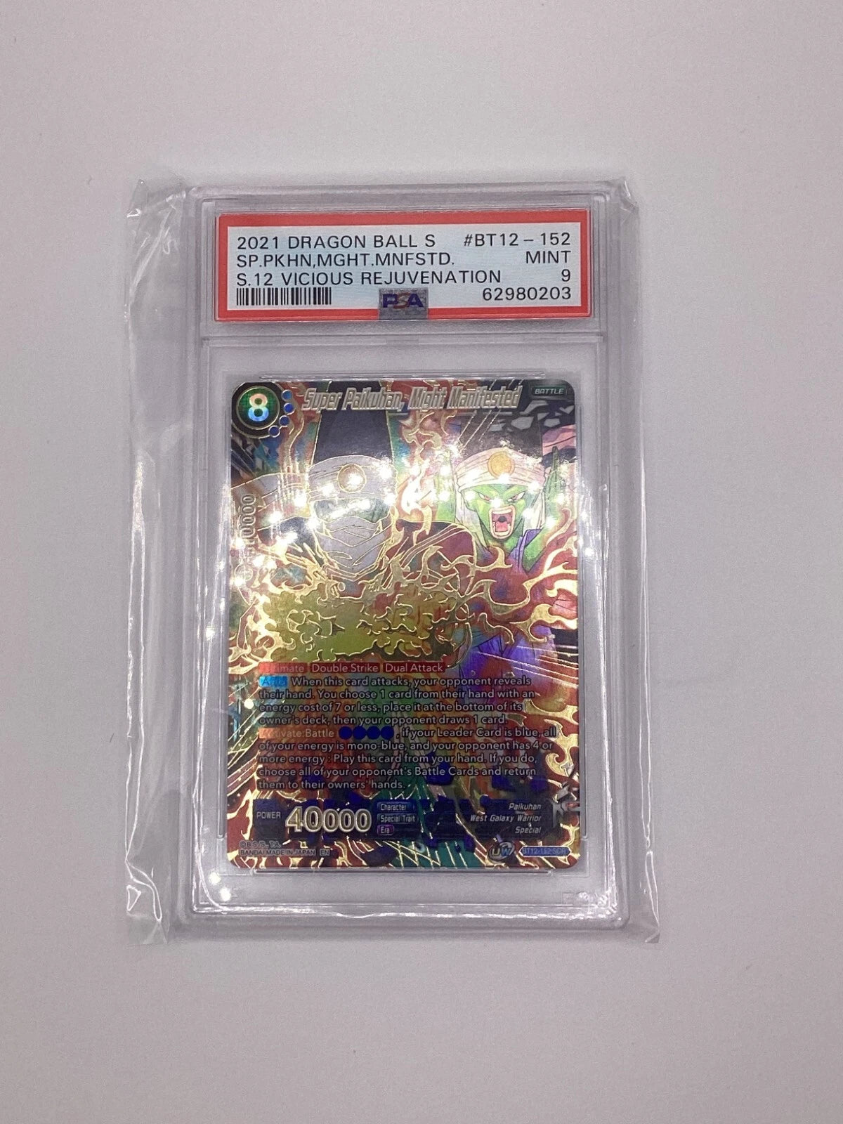 Super Paikuhan emerges in his most powerful form with this stunning Secret Rare from Dragon Ball Super Card Game's Booster Set 12. Card BT12-152 captures the intensity of Paikuhan's unleashed might, rendered in the premium Secret Rare treatment that collectors covet. Graded PSA 9, this card exhibits exceptional condition with sharp corners, vibrant colors, and pristine centeringβideal for serious collectors and competitive players alike. A must-have for Dragon Ball enthusiasts seeking high-grade, visually striking cards that command respect in any collection.
