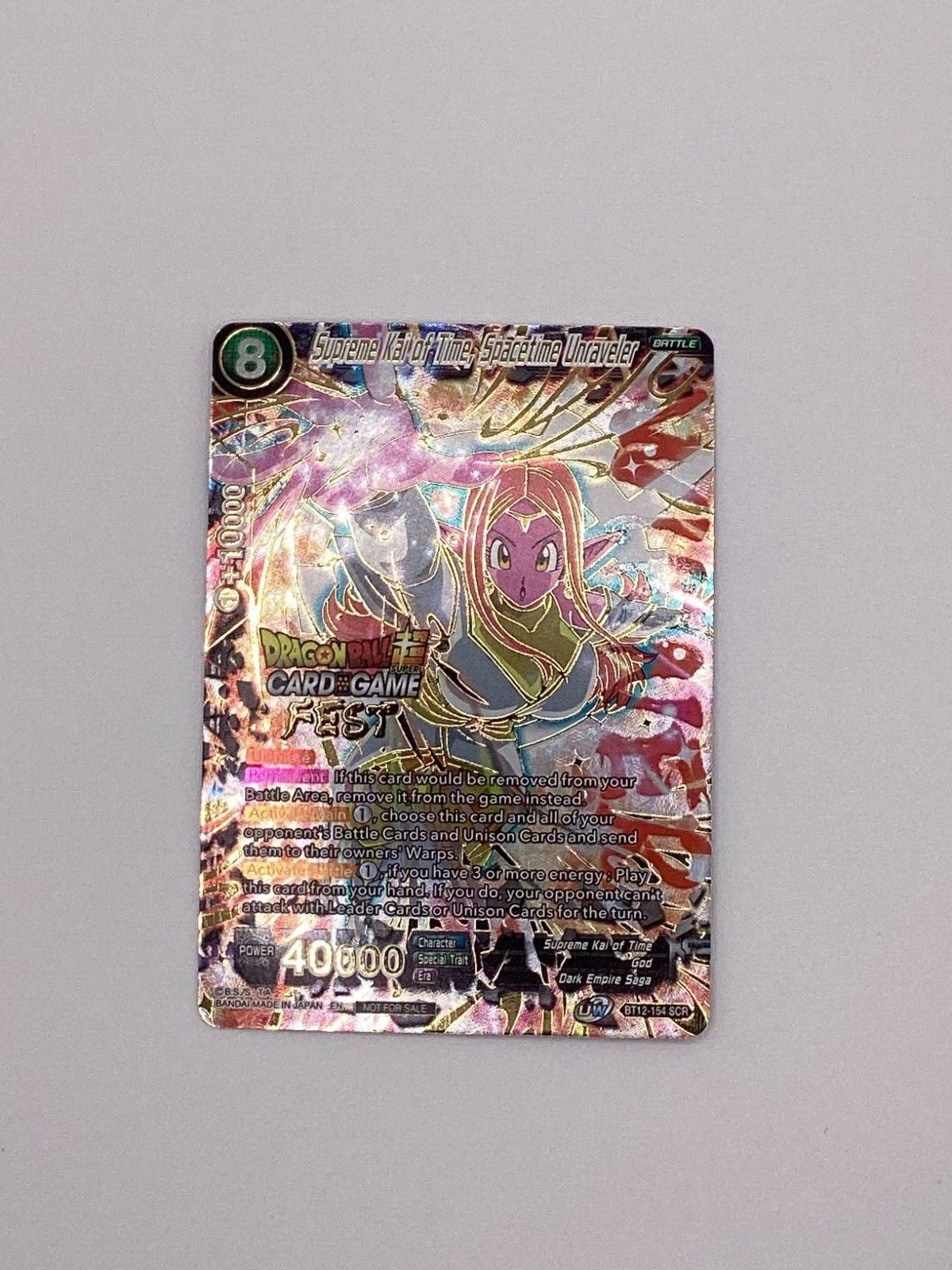 Supreme Kai of Time commands the very fabric of existence in this exceptional Spacetime Unraveler card. As a Winner-condition card in near mint condition, this piece represents peak playability and collectibility for serious Dragon Ball TCG enthusiasts. The card's pristine state ensures both competitive viability and investment potential. Whether you're building a tournament-ready deck or expanding a premium collection, this rare find delivers the power and prestige that defines high-tier gameplay. A must-have for players seeking dominance through temporal manipulation and strategic superiority.