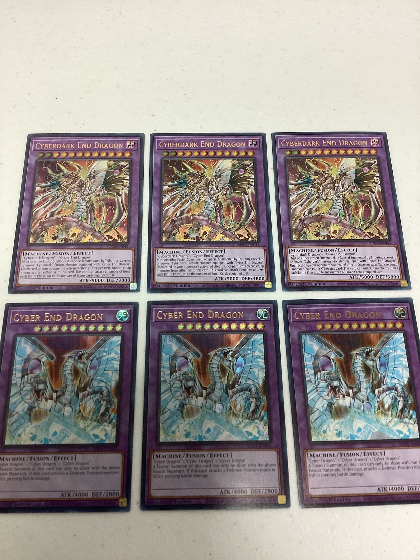 Secure this rare misprint playset featuring Cyberdark End Dragon and Cyber End Dragon in near mint condition. These powerful Fusion monsters are essential for competitive Cyber Dragon decks, offering devastating board control and synergy with archetype support. The misprint variant adds collectible value for serious enthusiasts. Each card maintains excellent condition with minimal wear, making this an ideal acquisition for players seeking tournament-ready copies or collectors pursuing variant editions. Perfect for upgrading your deck or completing your Cyber Dragon collection.